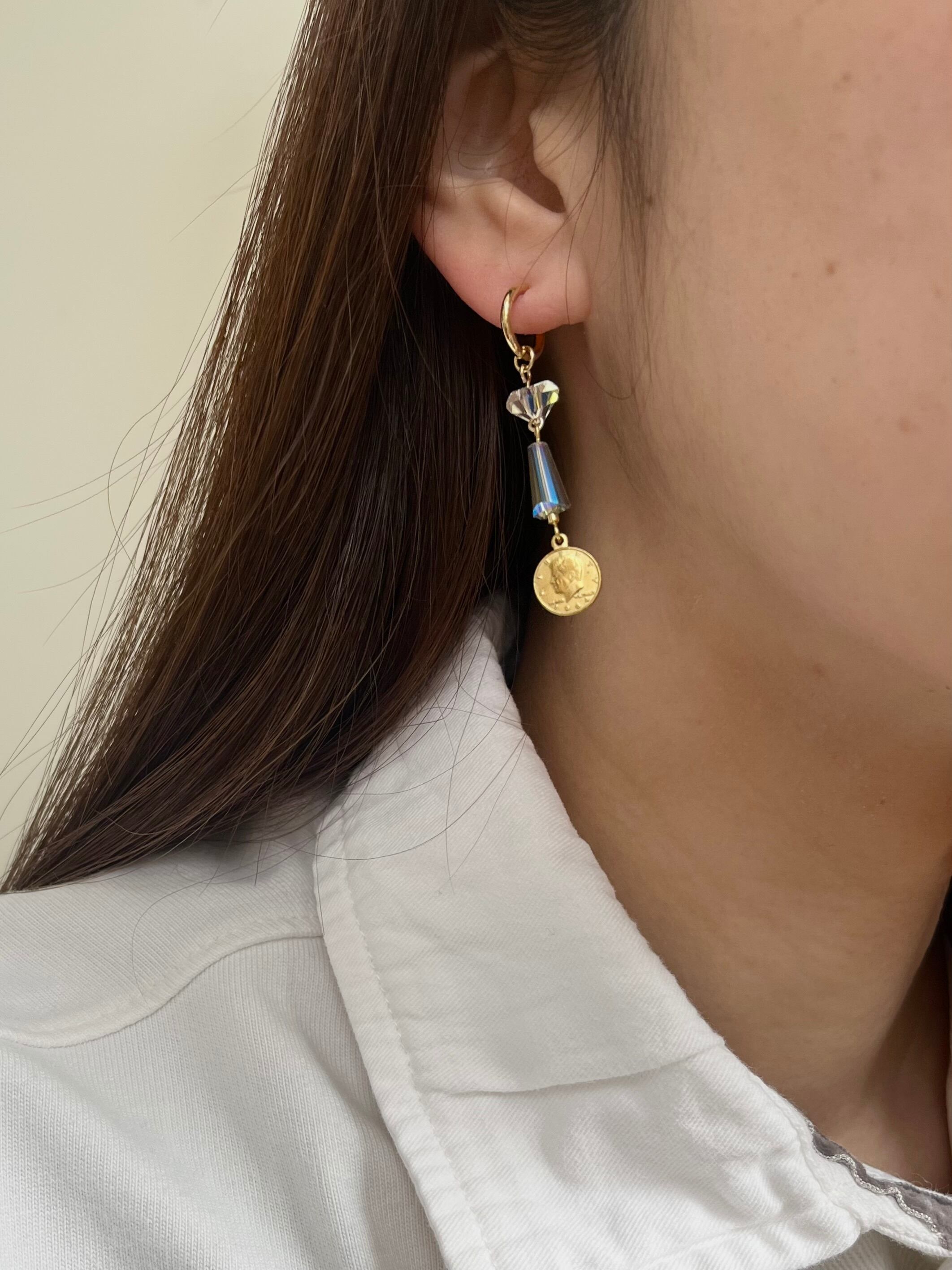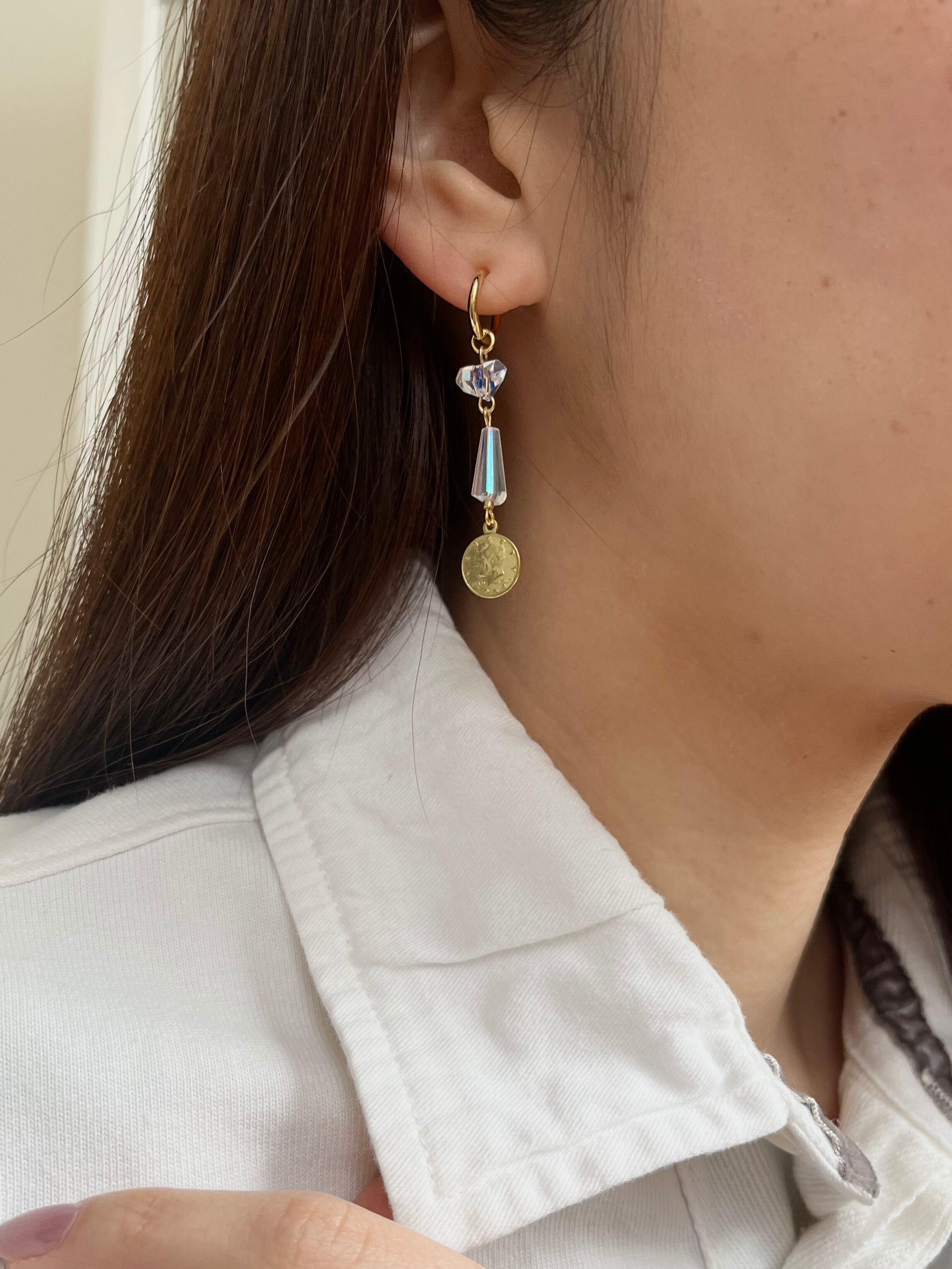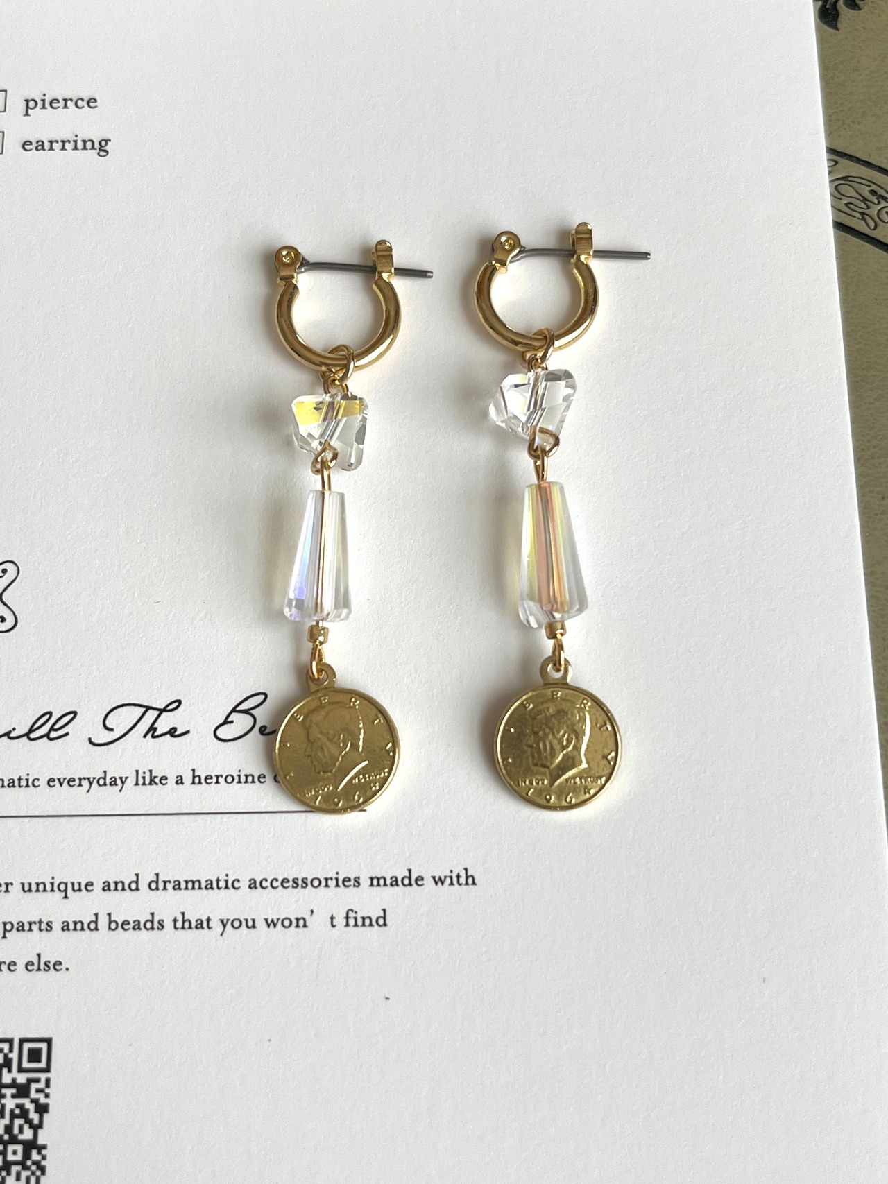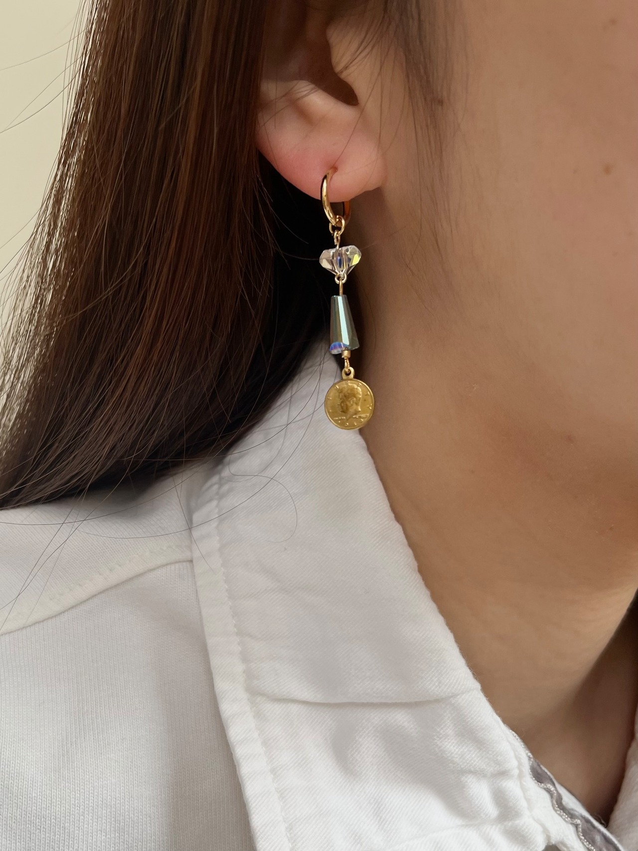 コインモチーフとカットガラスを組み合わせたフープピアス/イヤリング。