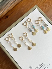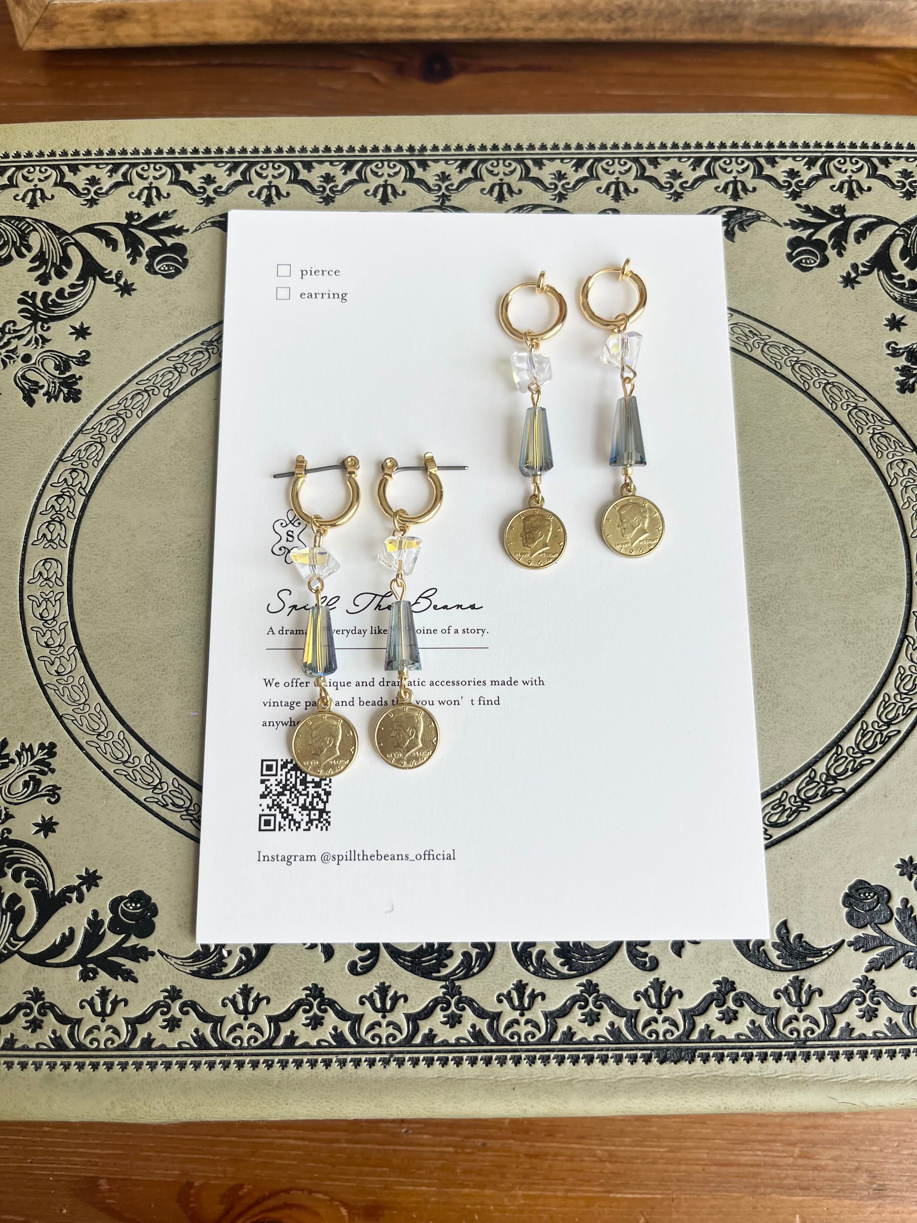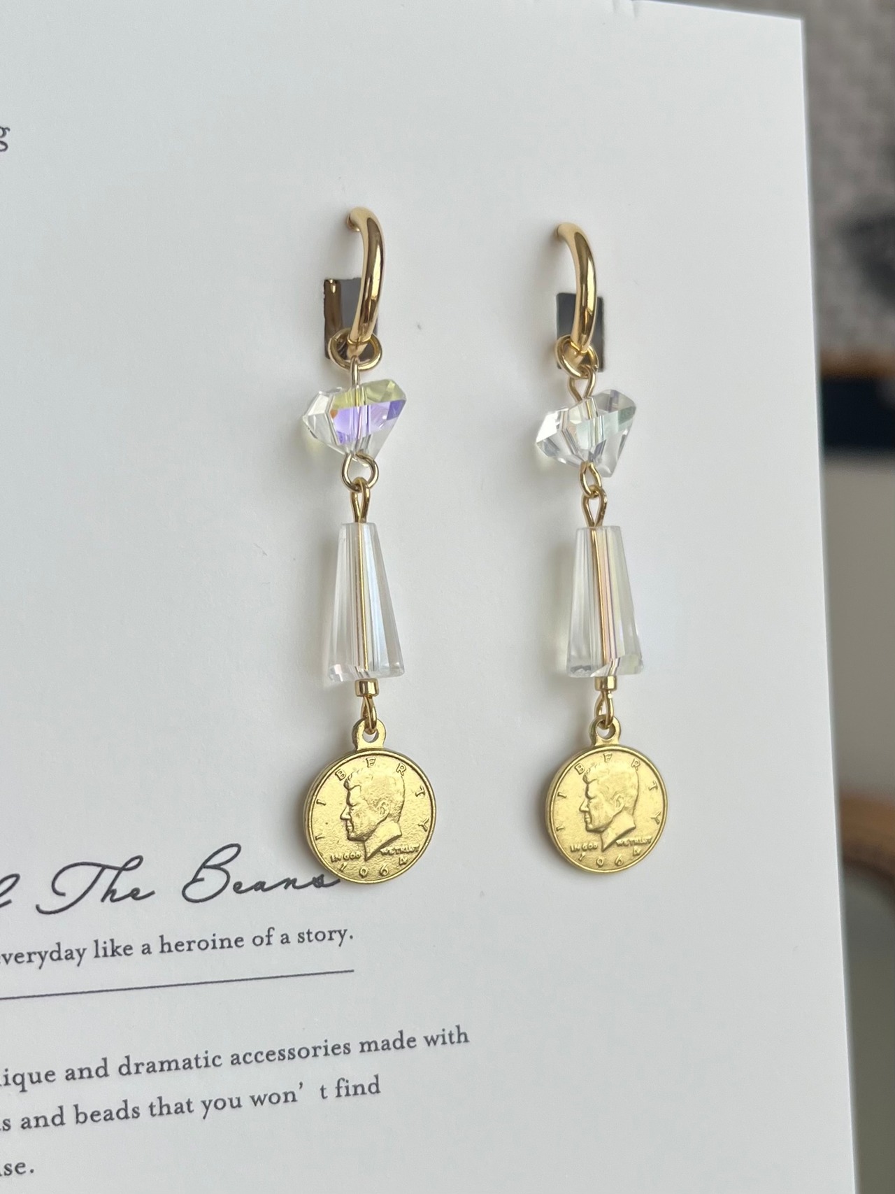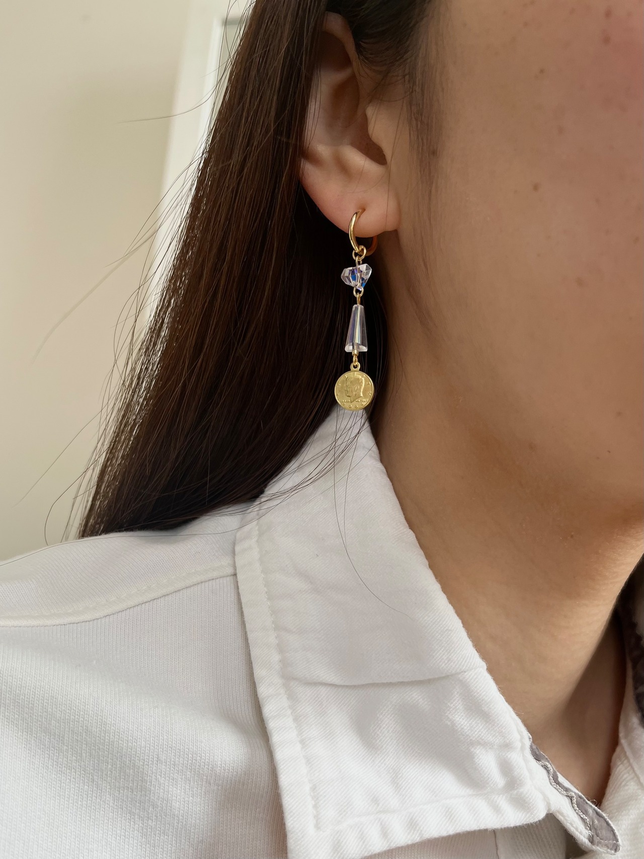 コインモチーフとカットガラスを組み合わせたフープピアス/イヤリング。