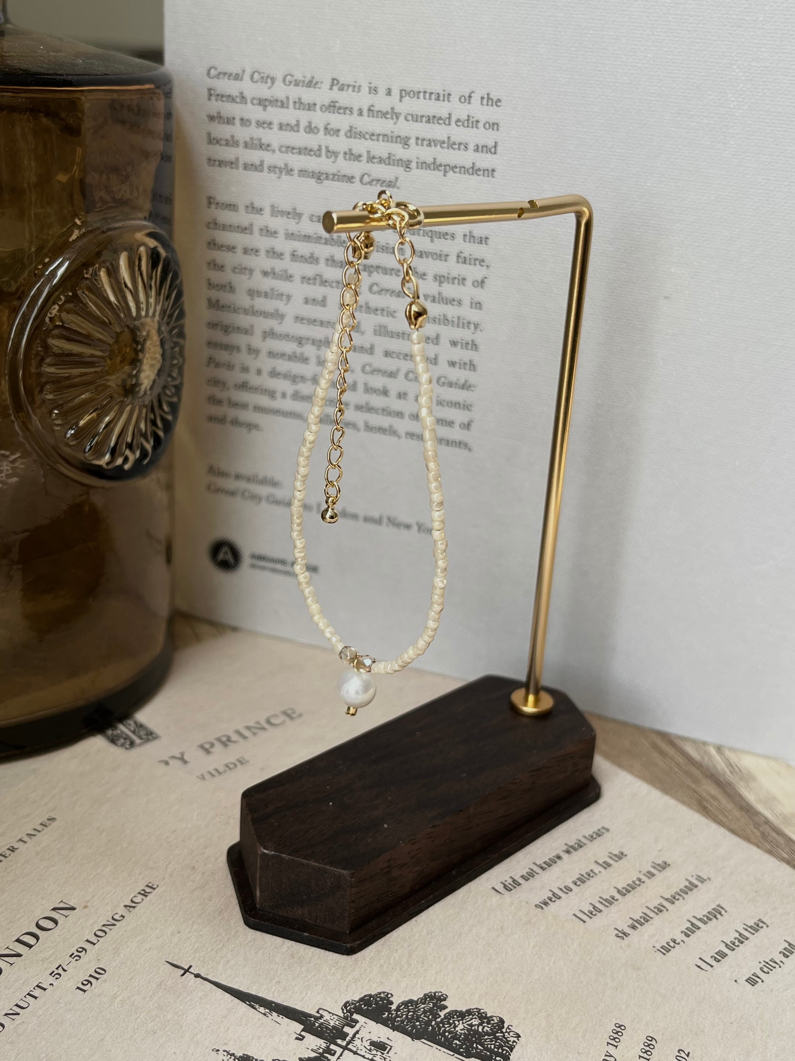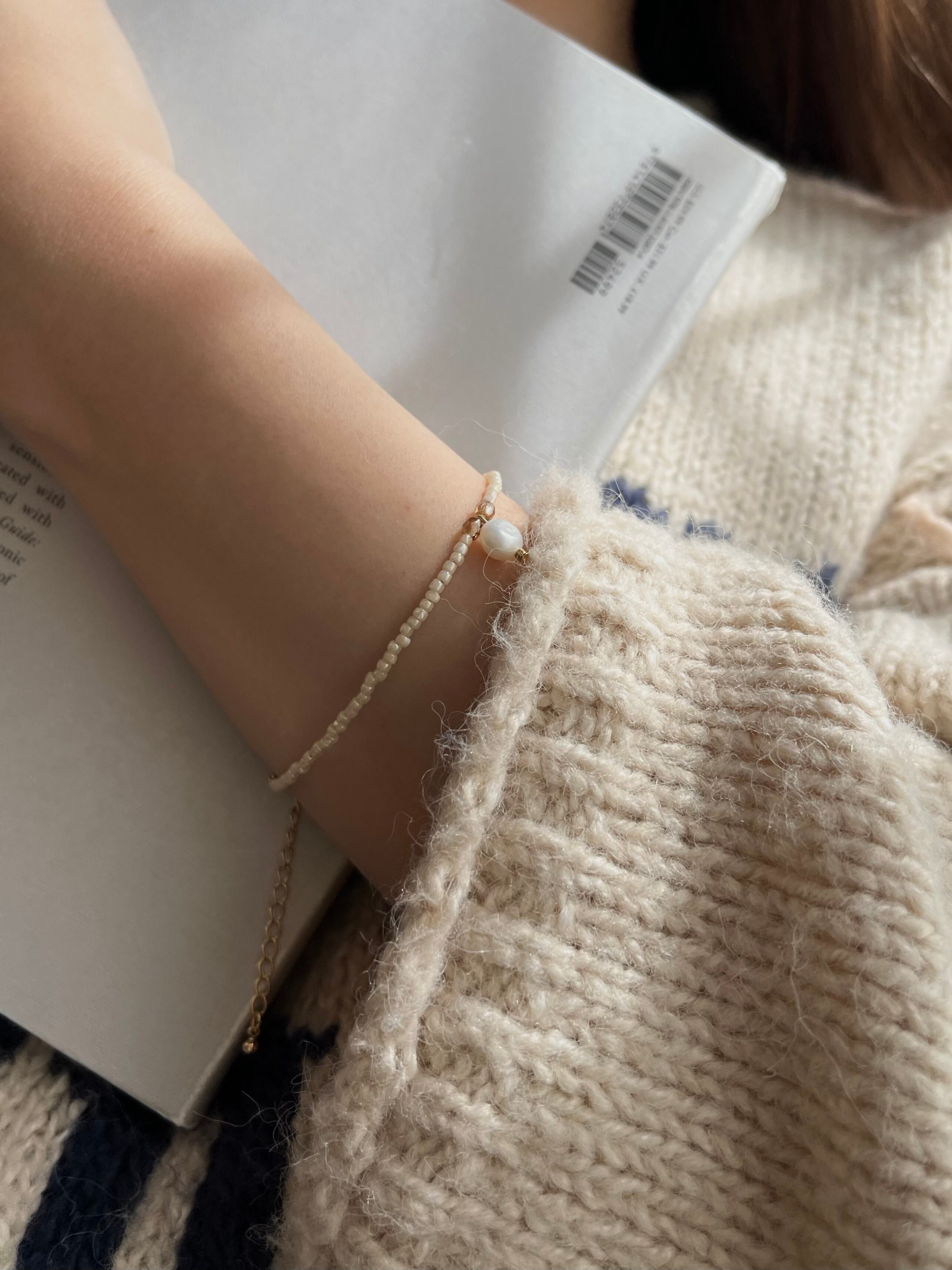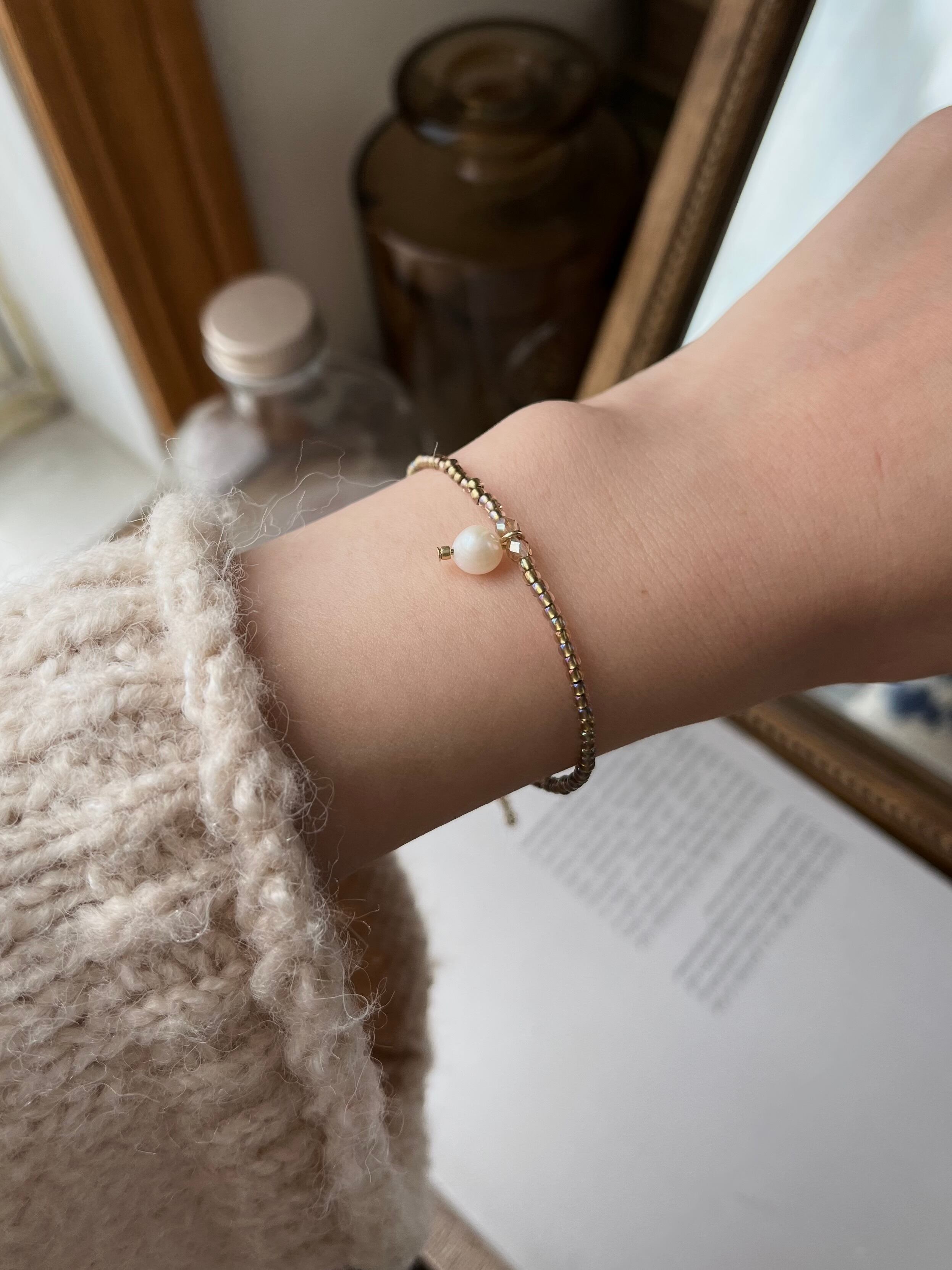 一粒の淡水パールを中央に、アンティークライクなカラーのガラスビーズで仕上げたブレスレット。