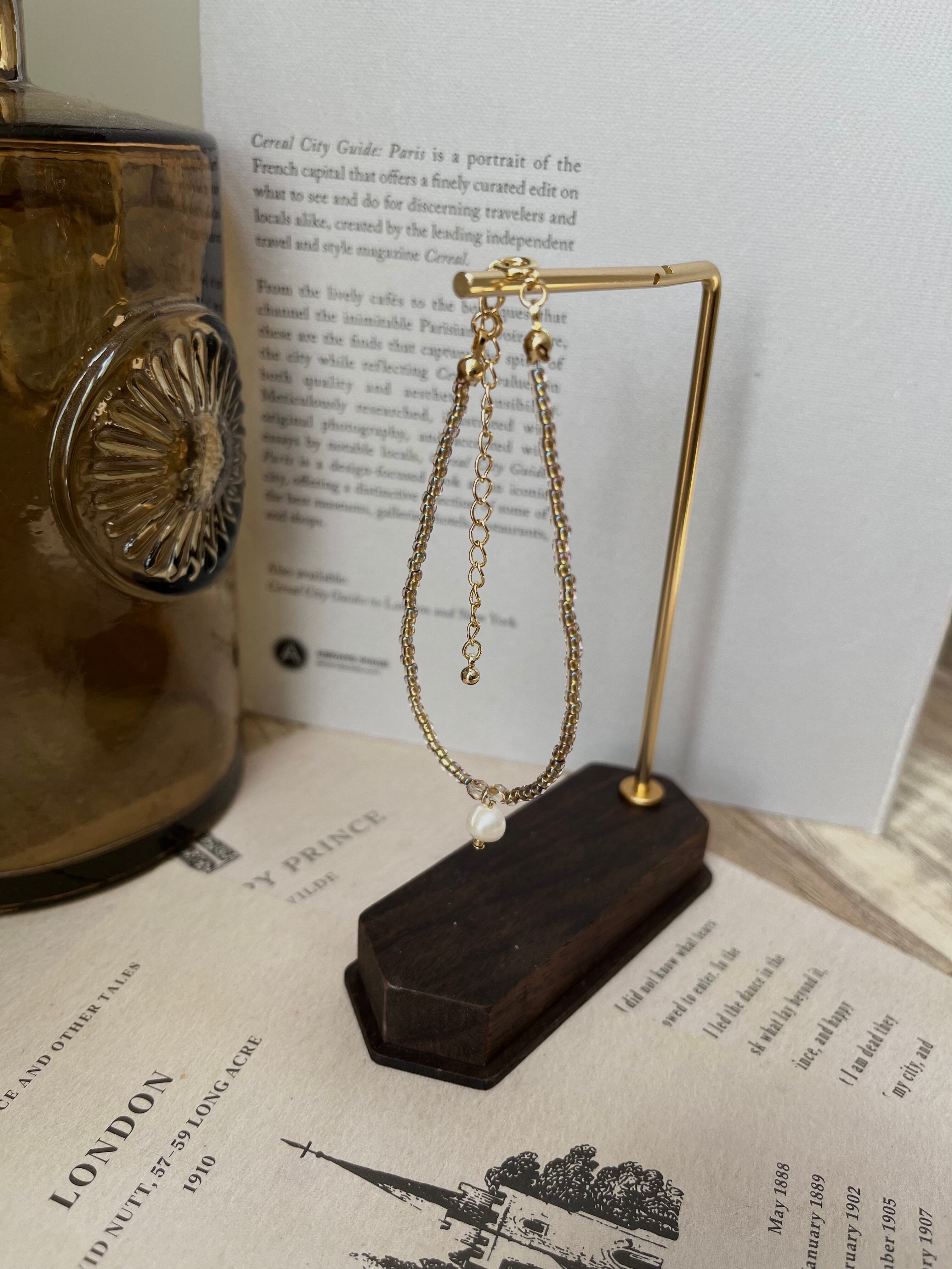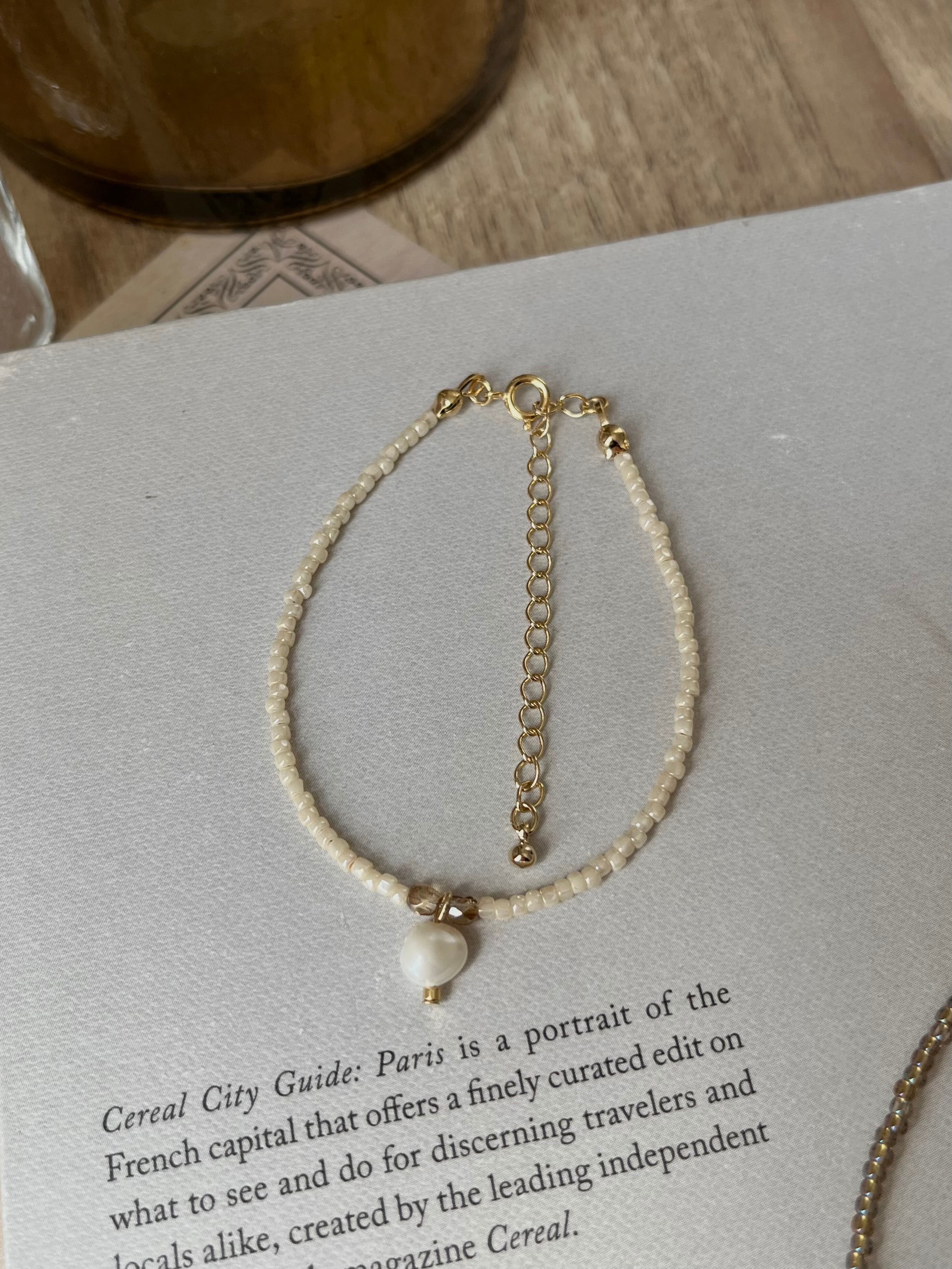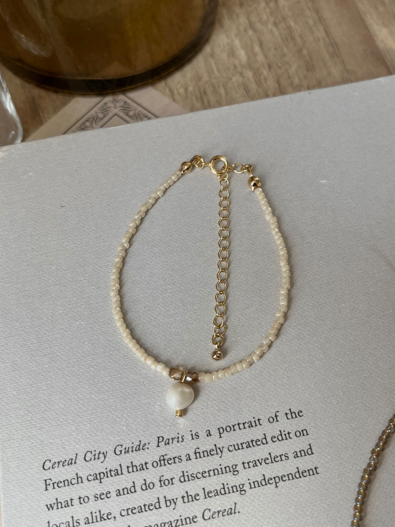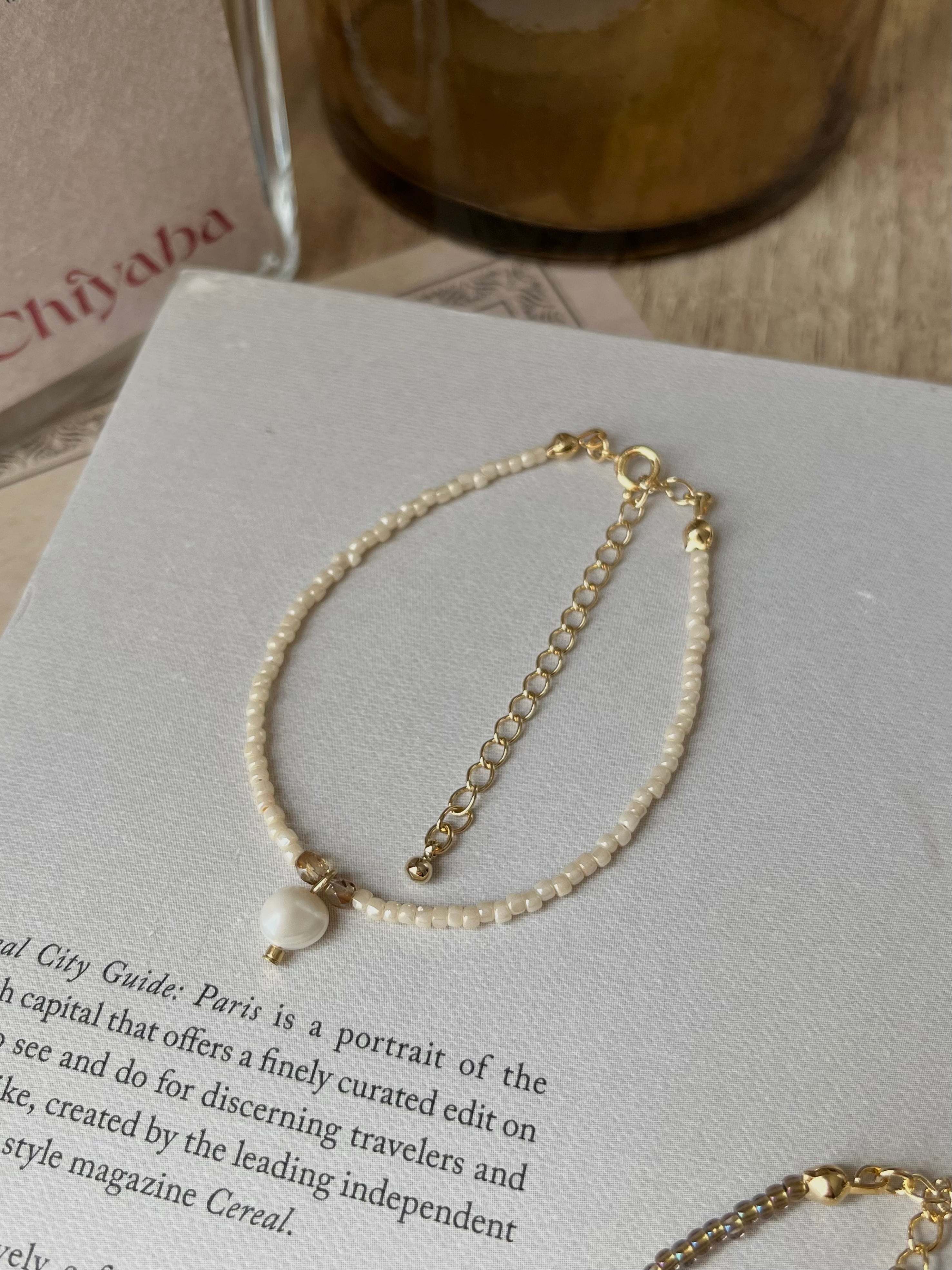 一粒の淡水パールを中央に、アンティークライクなカラーのガラスビーズで仕上げたブレスレット。