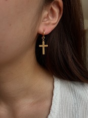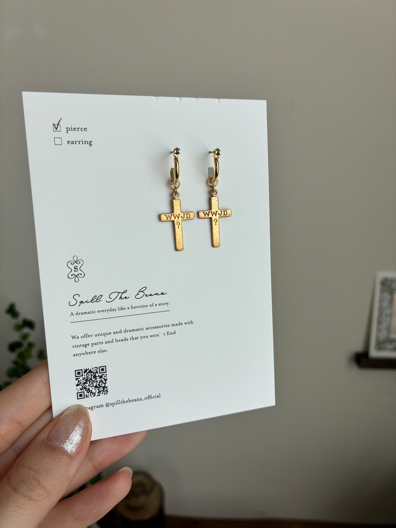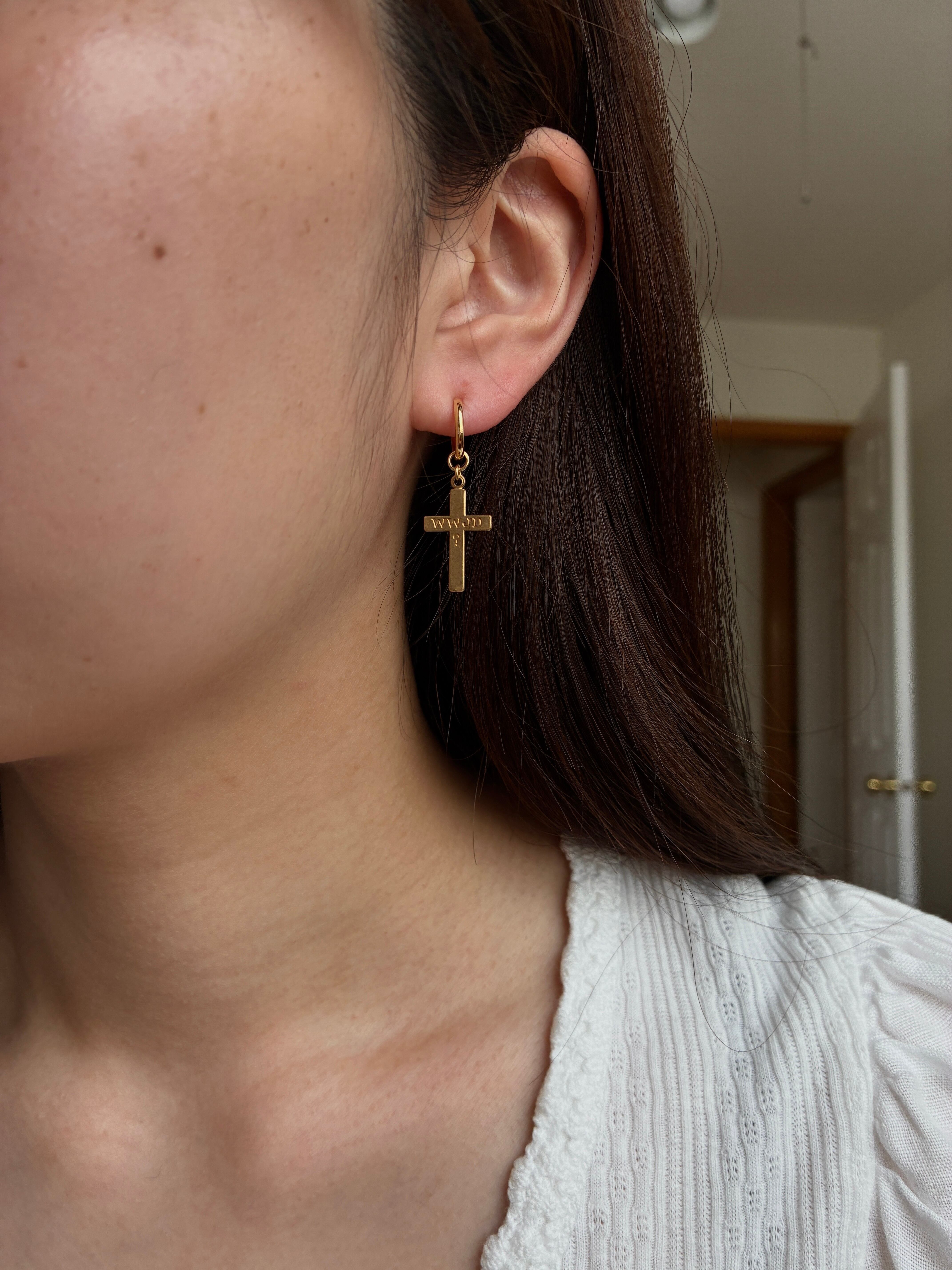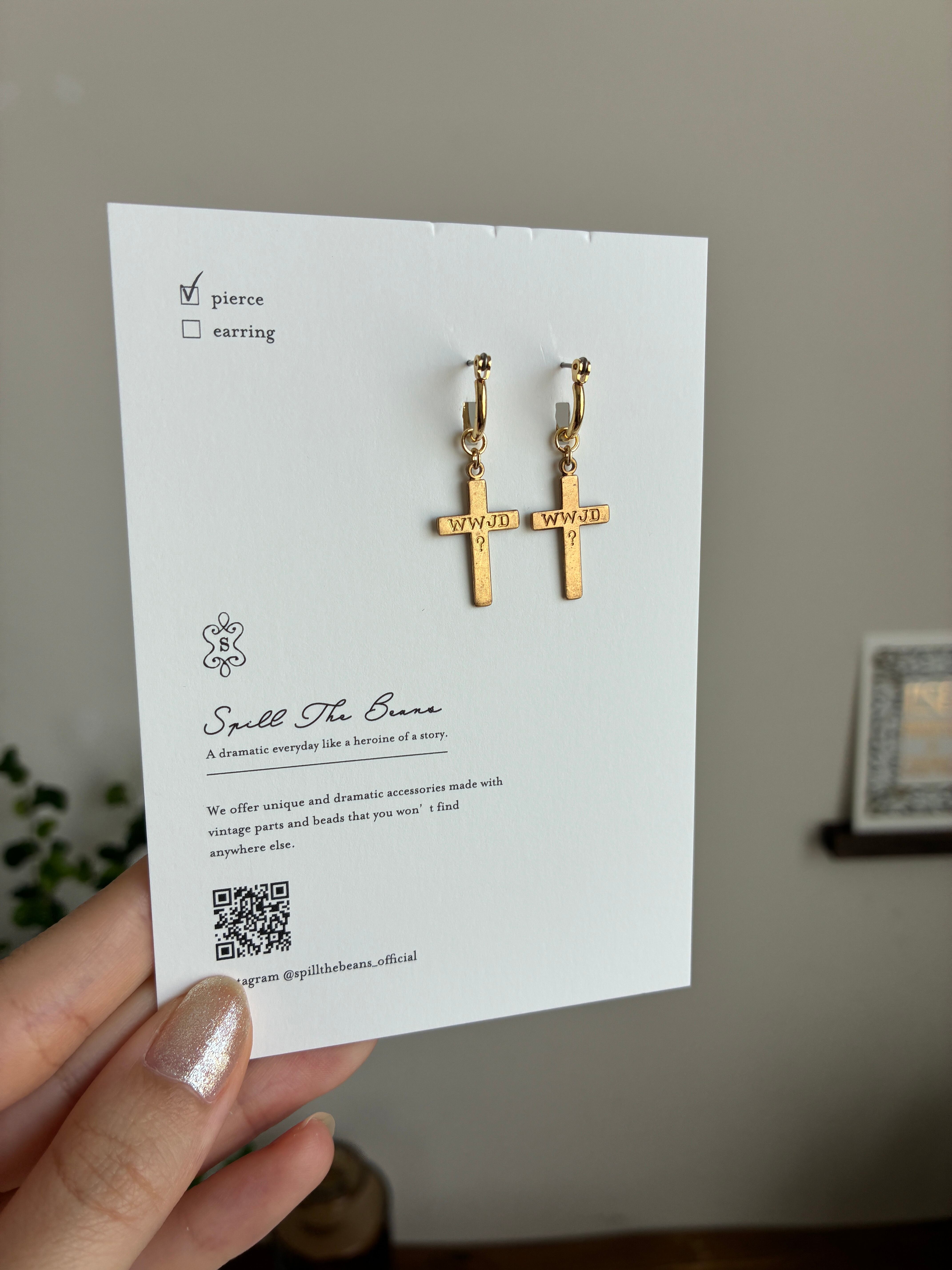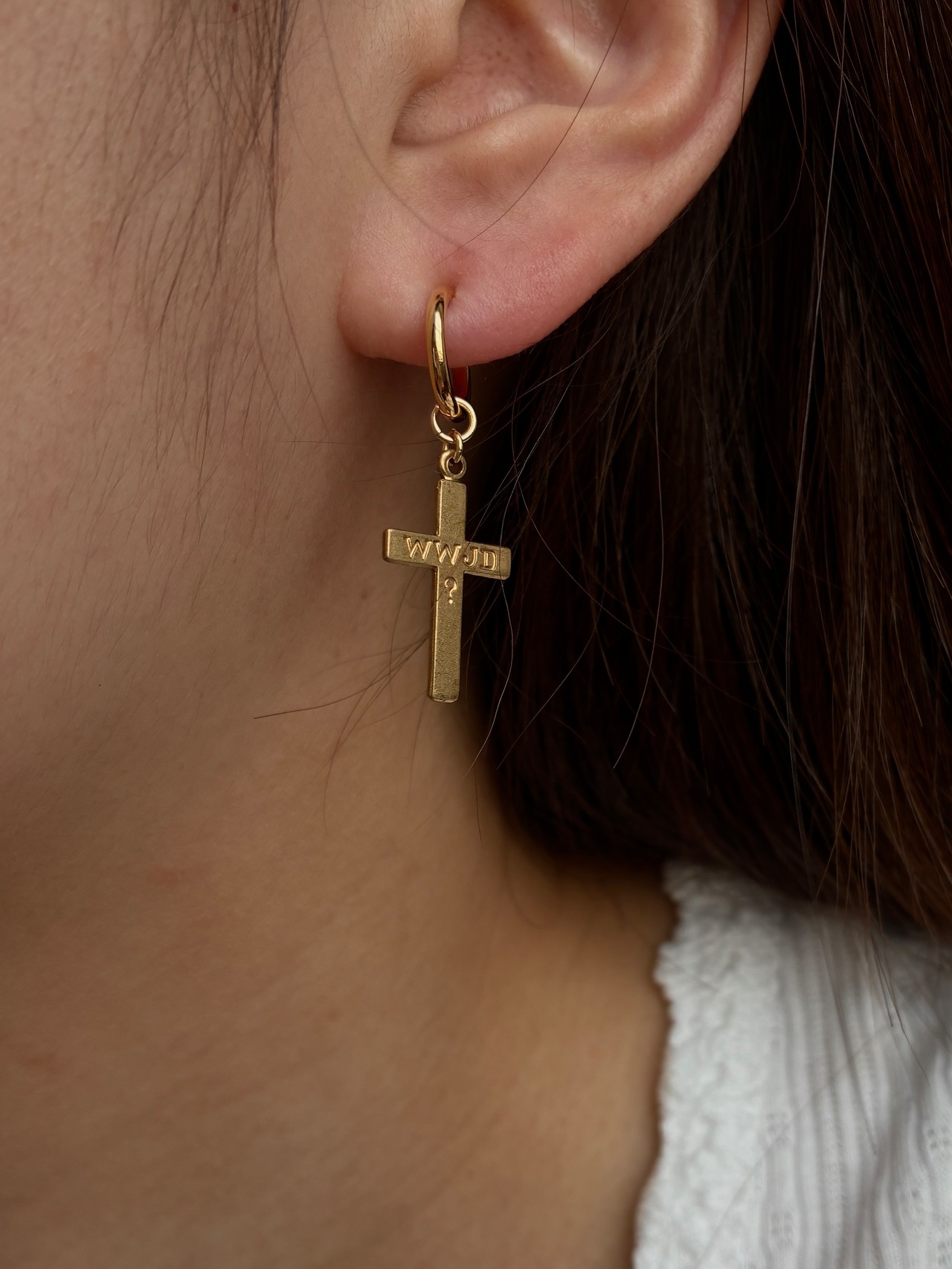 ”WWJD?”の刻印が入ったクロスチャームのフープピアス/イヤリング。