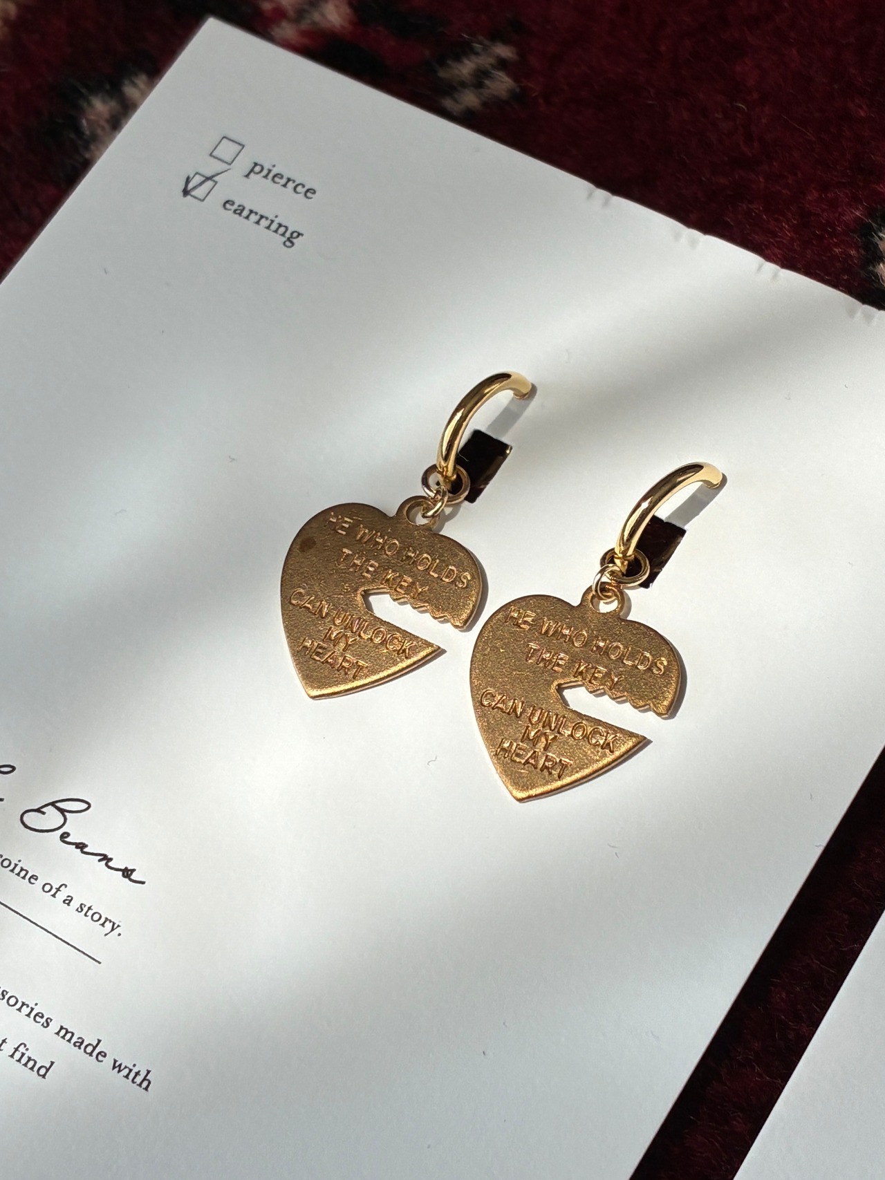 鍵の形が型どられたハートBRASSプレートのフープピアス/イヤリング。