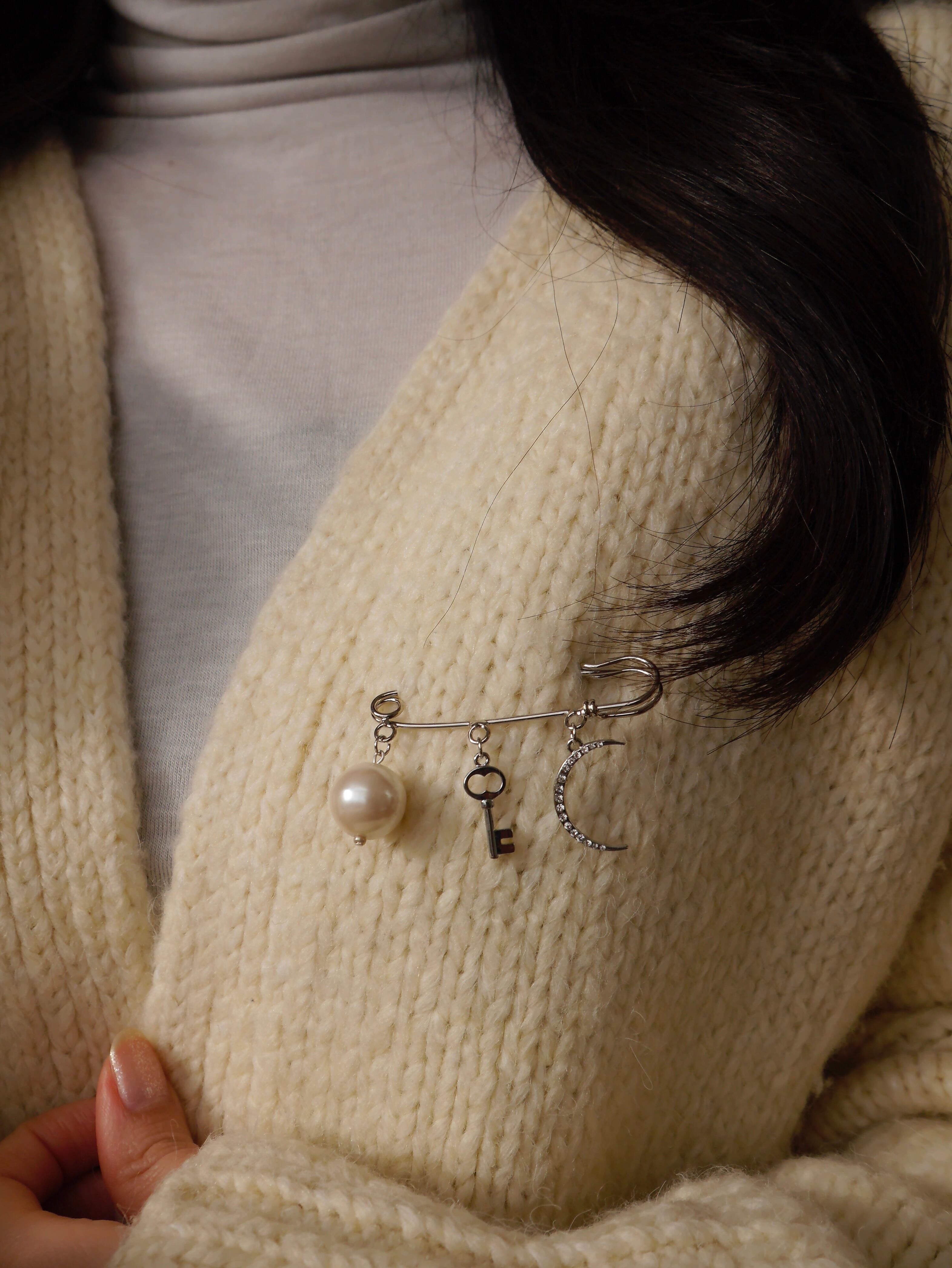 大粒パール、カギ、クレッセントムーンのキャッチーな3つのモチーフチャームのブローチ。