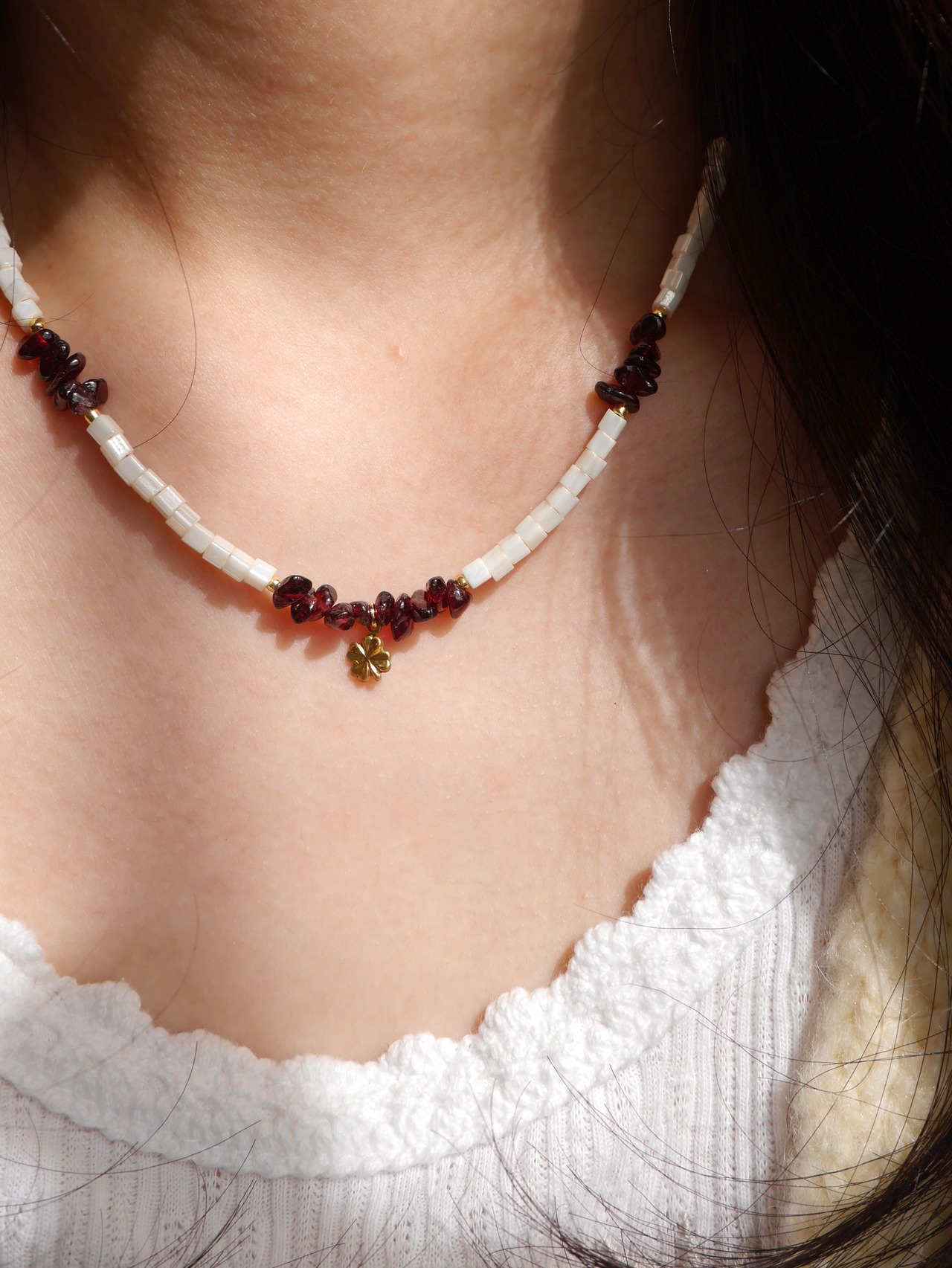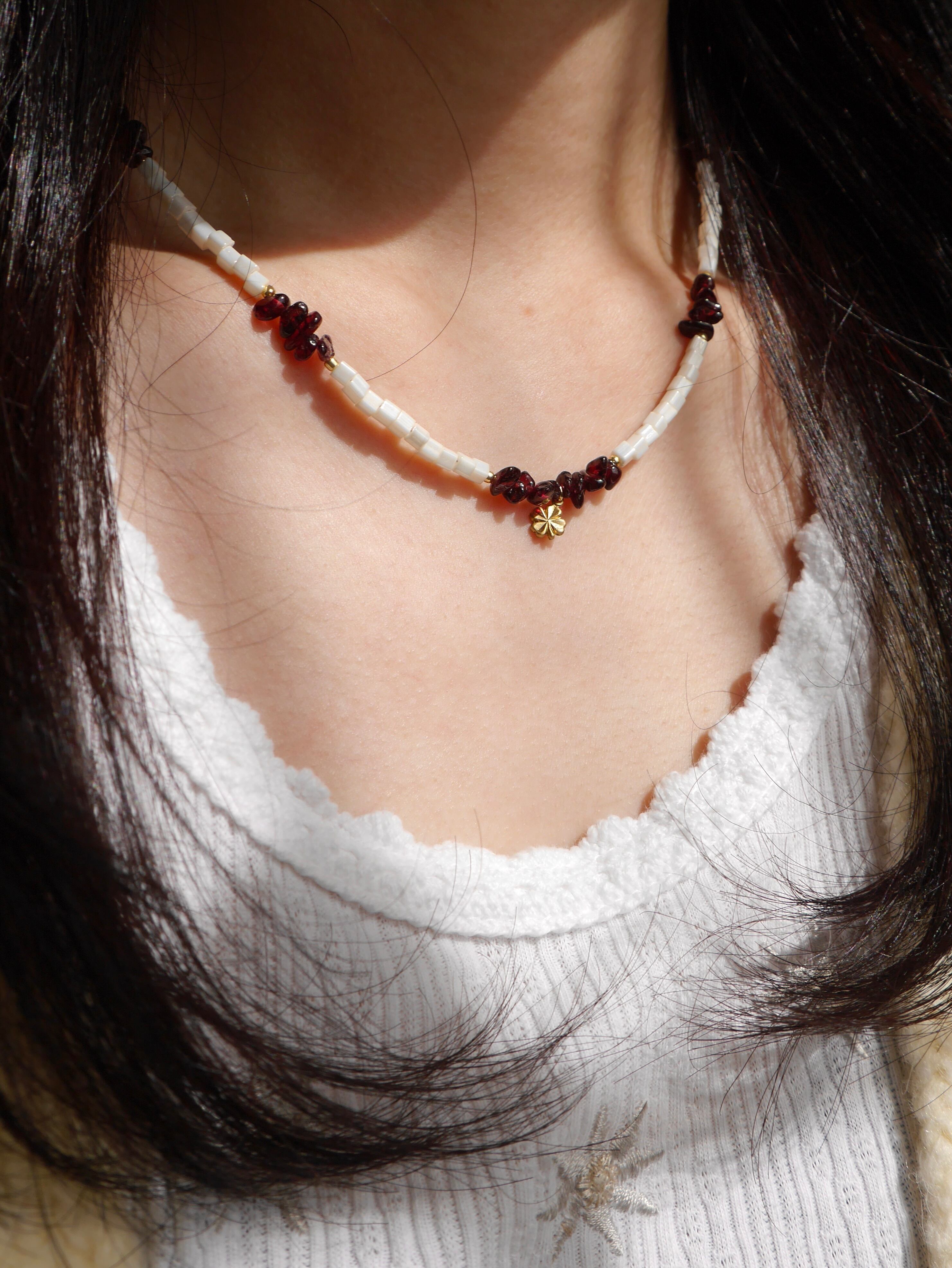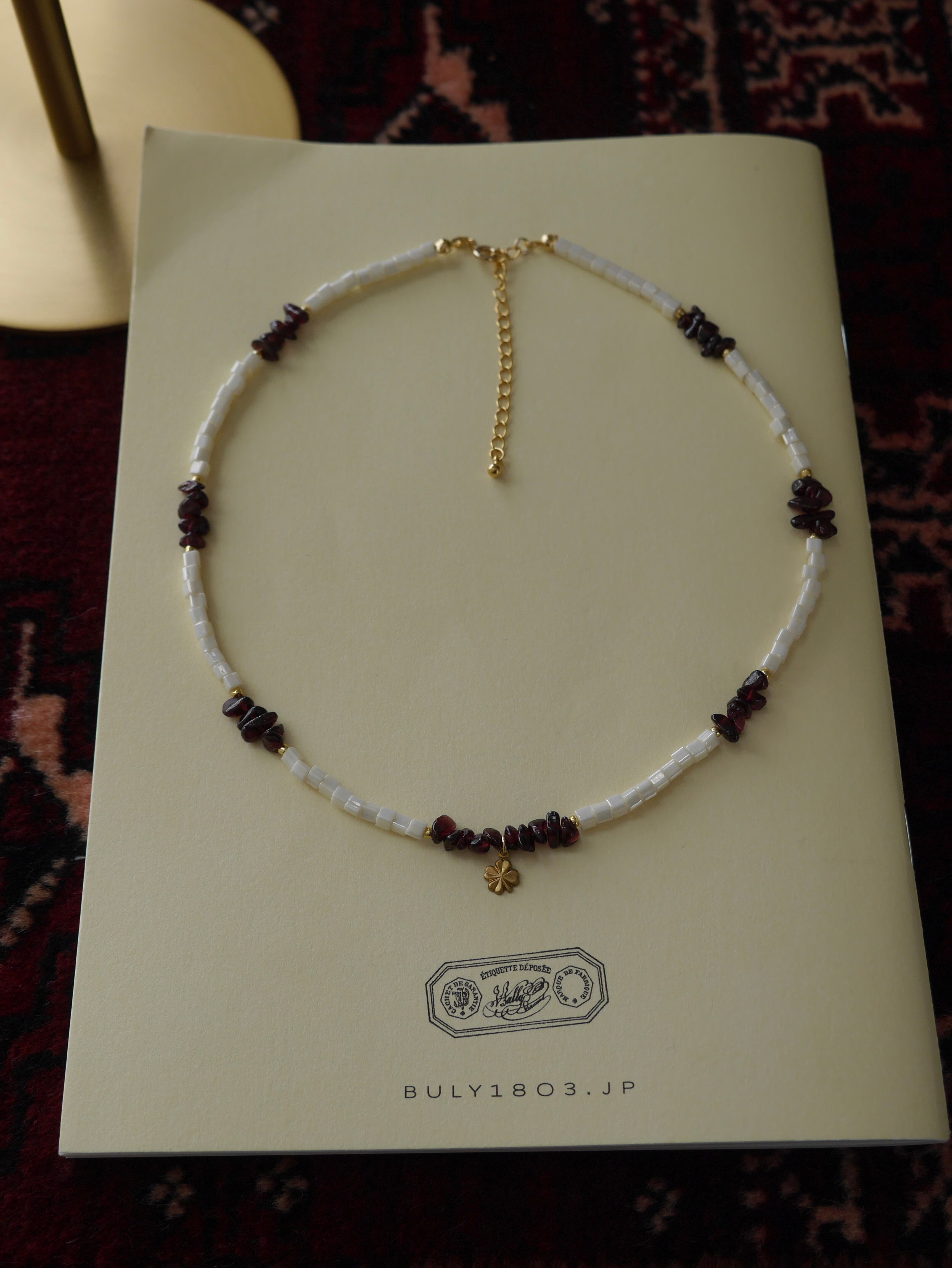 天然石ガーネットとガラスビーズで仕上げたネックレス。