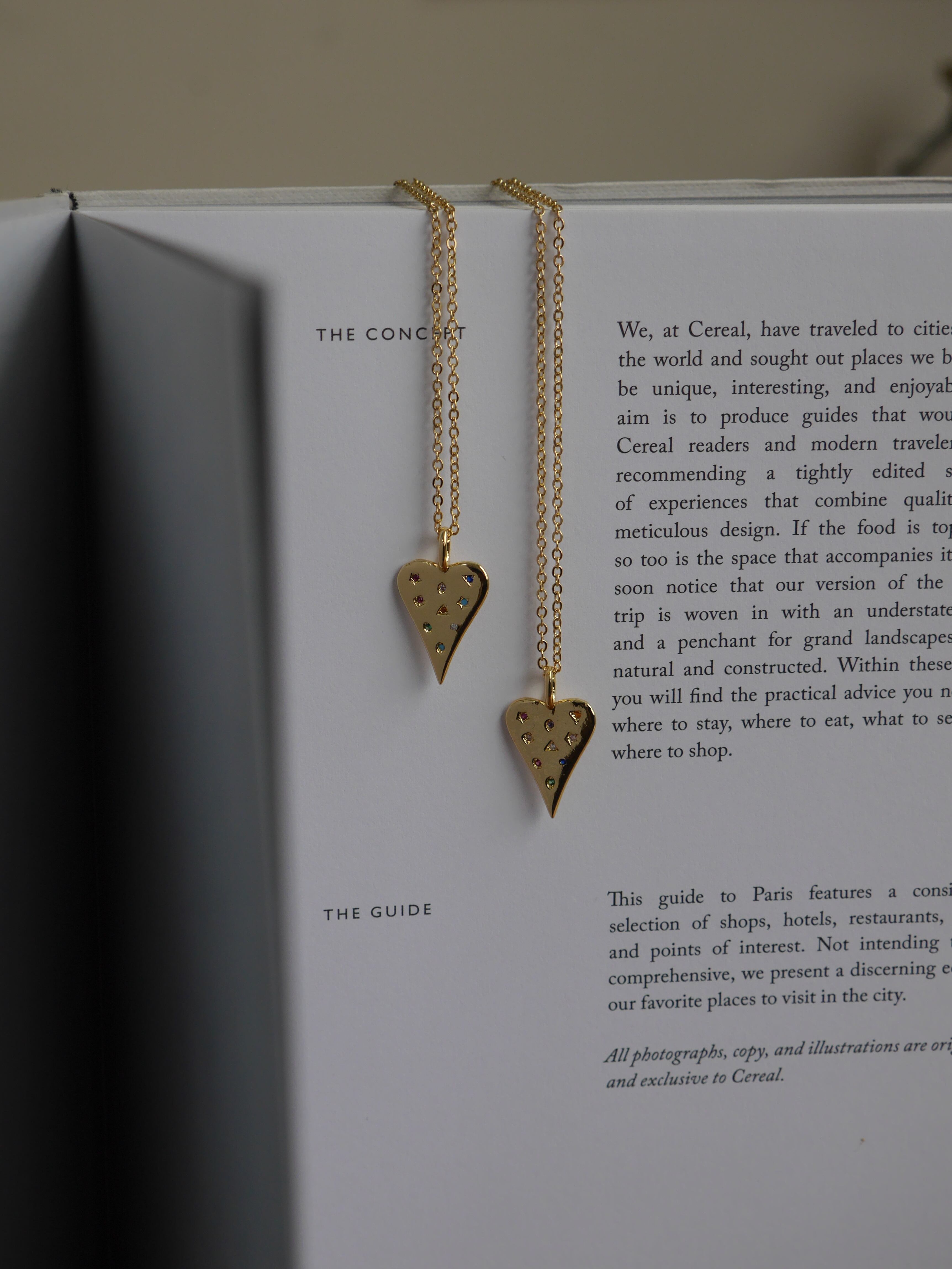 カラーストーンが埋め込まれたキャチーなハートチャームのネックレス。