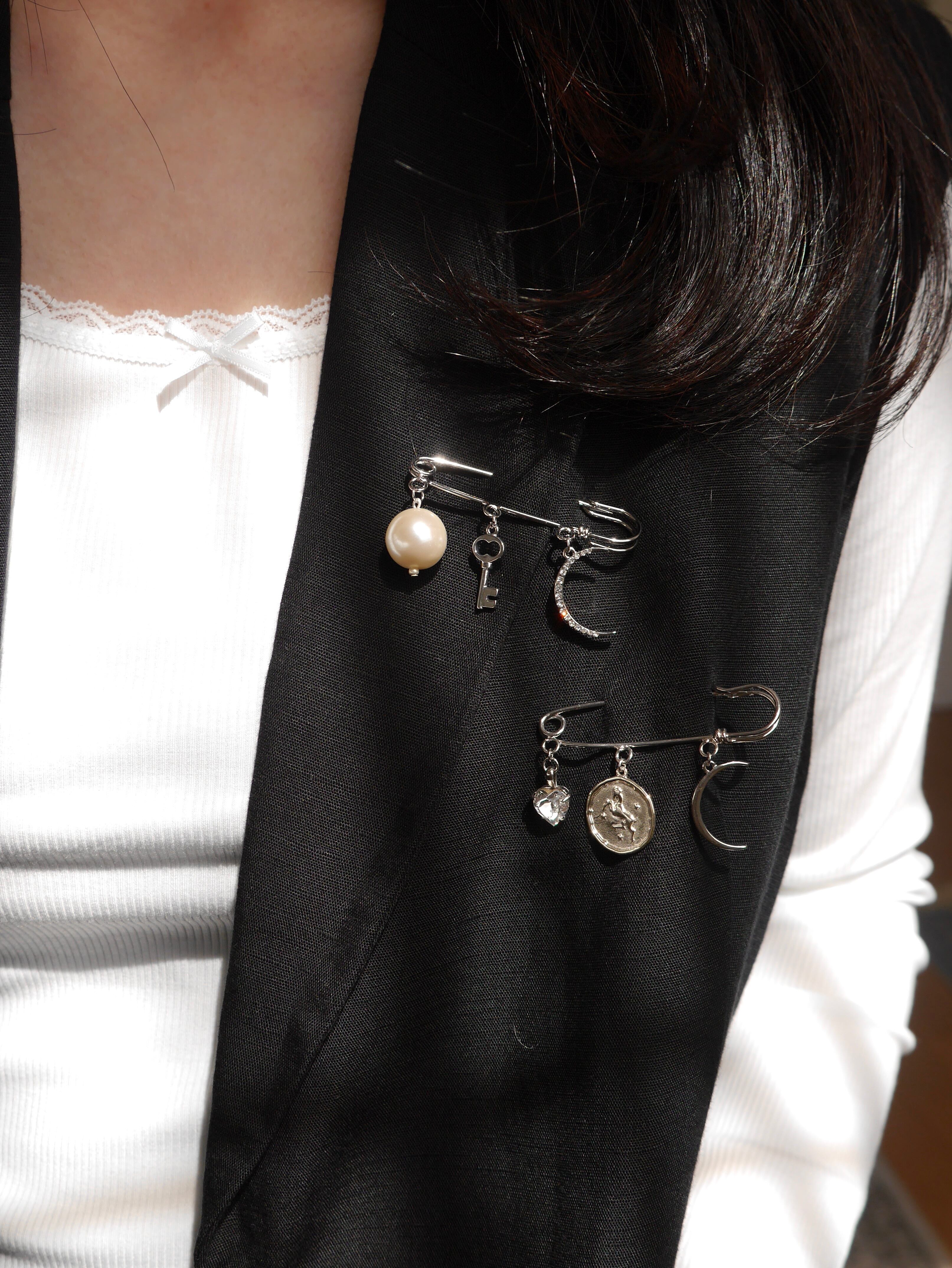 ハートクリスタル、ホース柄コイン、クレッセントムーンのキャッチーな3つのモチーフチャームのブローチ。