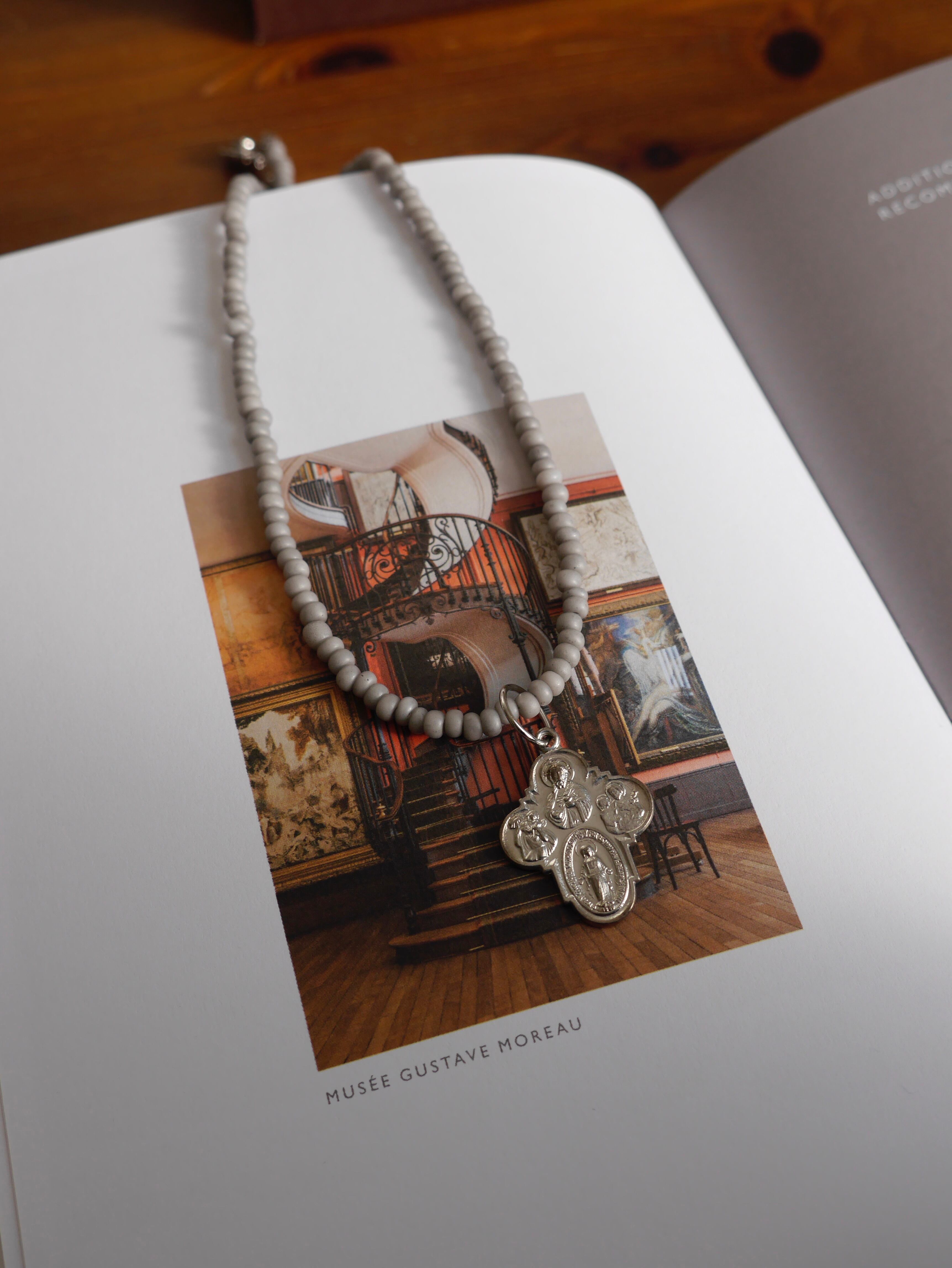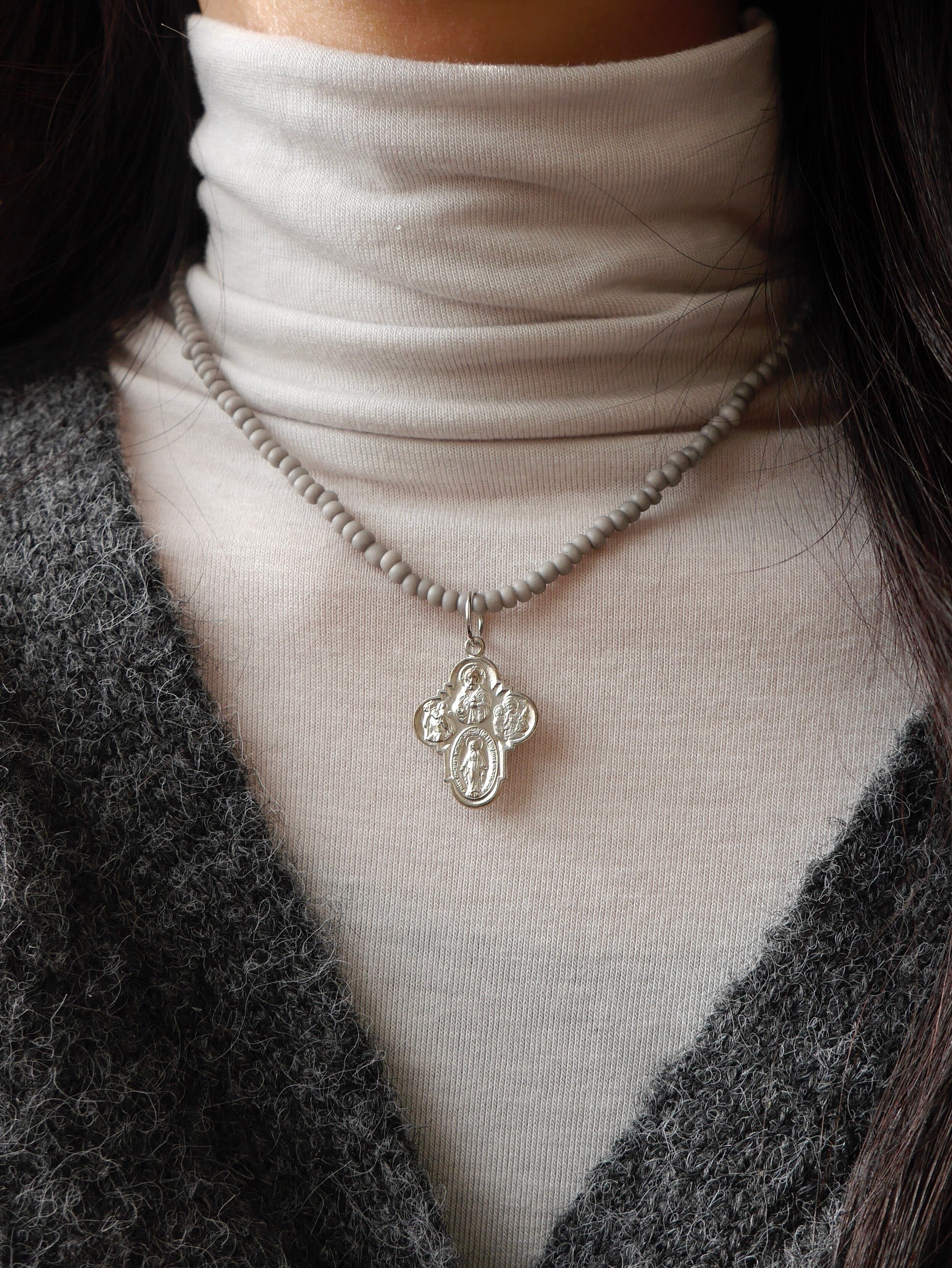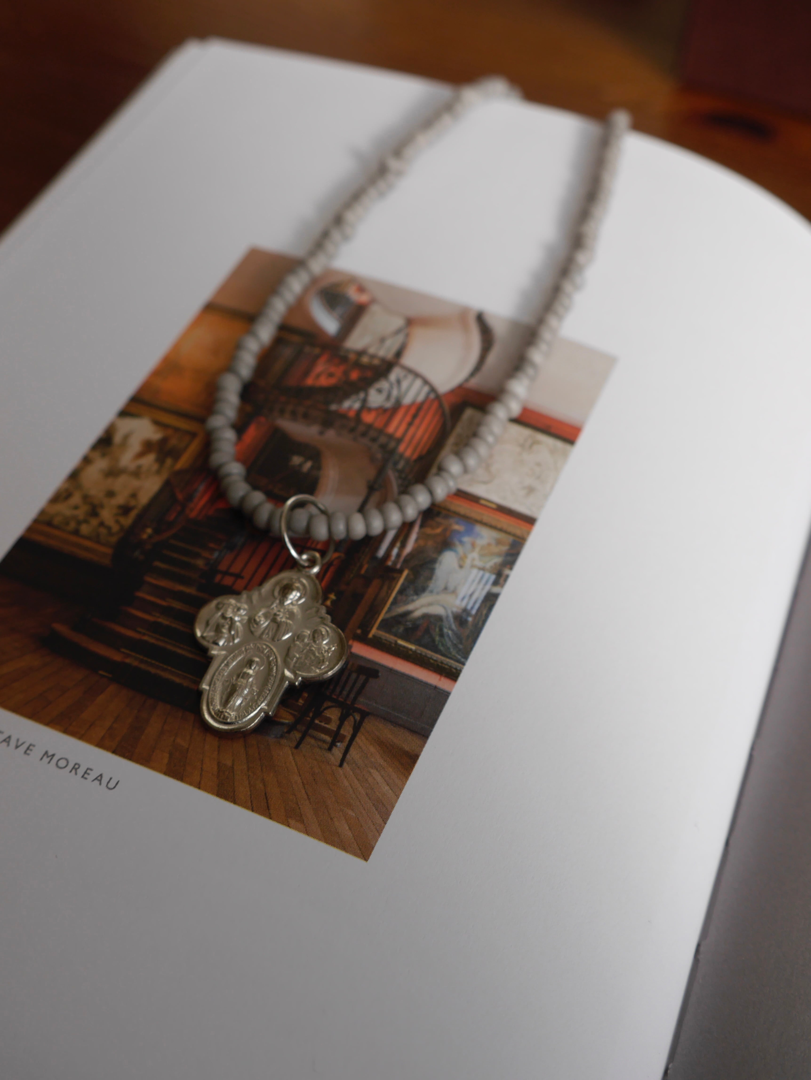 チェコヴィンテージビーズに、イタリアヴィンテージのクロス型メダイを合わせたネックレス。細かなデザインが施された美しいメダイ。